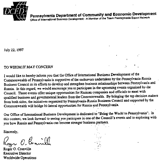 I am pleased to write on behalf of the Third Annual Pennsylvania-Russia Business Opportunity Symposium in Philadelphia, Pennsylvania. The Office of International Business Development of the Commonwealth of Pennsylvania is supportive of the Pennsylvania-Russia Business Council's efforts to develop and strengthen business ties between Pennsylvania and Russia.